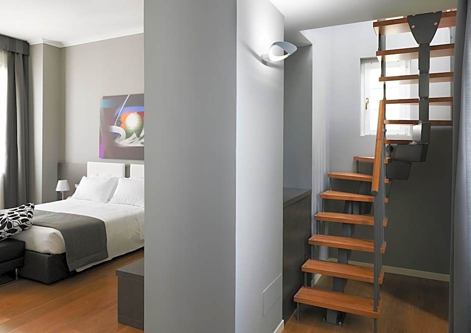 Large split-level suite. The first level has 2 city-view balconies, 1 bedroom, a living room with TV, and a bathroom with spa bath. Upstairs there is a twin room with TV, and a bathroom with hydromassage shower.
